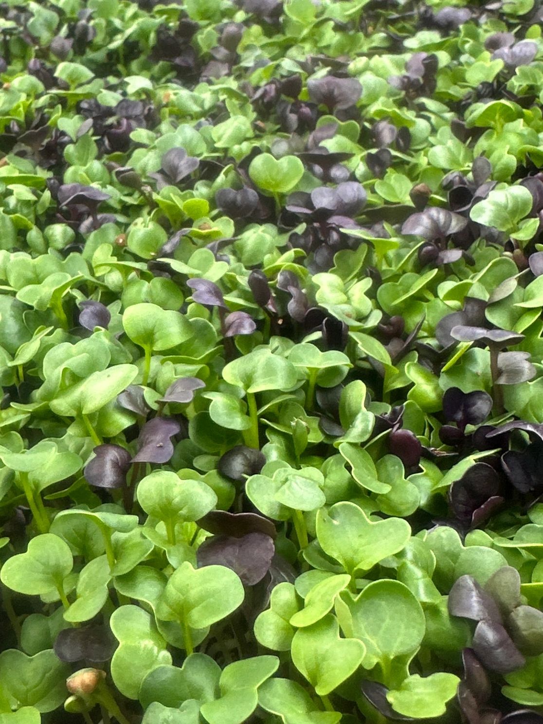 Sunflower, Pea Shoots, Spicy Daikon Radish, Purple and Rose Radish, Tatsoi, Red Acre Cabbage, Mustards, Broccoli, Kale, Salad Mix, Carrot and dill mixes.